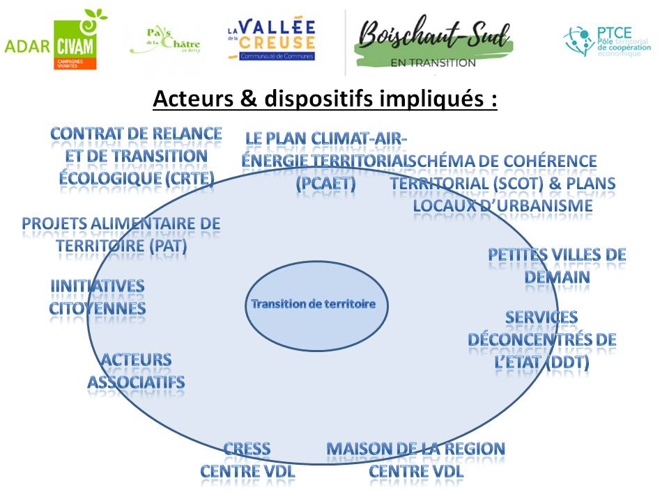 La démarche « Boischaut Sud en transition » a être amorcée en 2020 avec l’appui notamment de la Région Centre via le dispositif A vos ID, mais aussi le Programme Tressons, la Banque des Territoires…Initiée par une alliance constituée de l’ADAR-Civam, la MJCS La Châtre et l’association S-Composition et avec l’appui méthodologie des Localos/La Traverse, elle a permis de réaliser un état des lieu participatif et de rédiger des fiches horizons 2030 en associant différentes catégories d’acteurs (citoyens, élus communaux et EPCI, associatifs, techniciens…) Des projets pilotes ont également et initiés ou développés (résilience alimentaire locale à travers un PAT et son essaimage, résilience sociale et culturelle à travers la création de nouvelles formes de dialogue entre agriculture et société via les méthodes et outils de S-Composition, résilience économique et économie circulaire à travers la mise en place d’ateliers de réemploi d’objets et l’appui à la création d’une association dédiée Recup&Créer…) Une fiche de capitalisation présente la méthode, les actions et les résultats.