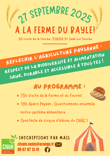 Ce moment d’échange sera l’occasion de connaître une ferme du CIVAM qui porte ses valeurs et les met en application par ses choix et ses pratiques, ainsi que de réfléchir collectivement aux questions de démocratie alimentaire et d’accessibilité à une alimentation saine et durable sur notre territoire.