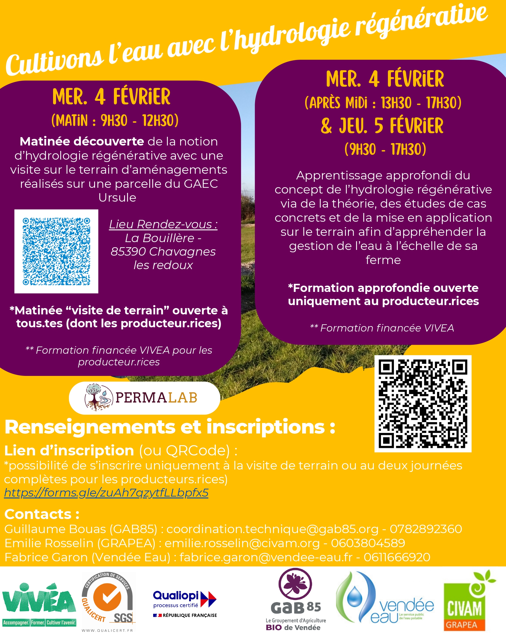 Inscriptions et contact : Emilie (GRAPEA) : 06 03 80 45 89, emilie.rosselin@civam.org ou Guillaume (GAB 85) : 07 82 89 23 60, coordination.technique@gab85.org
